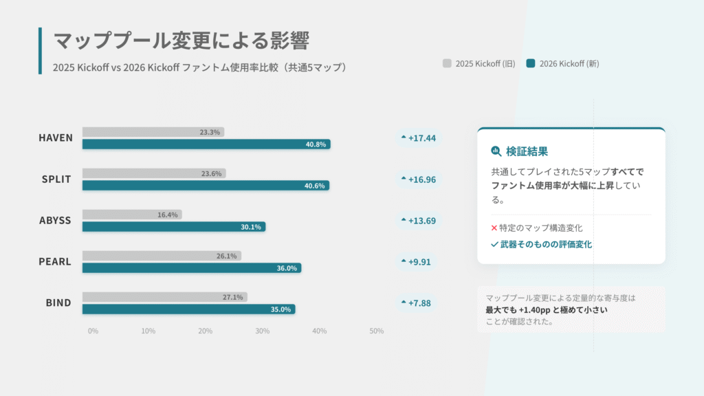 - マッププール変更の寄与は最大+1.40ppと極めて小さく、全マップで広範にファントム率が上昇しているため主因ではない。