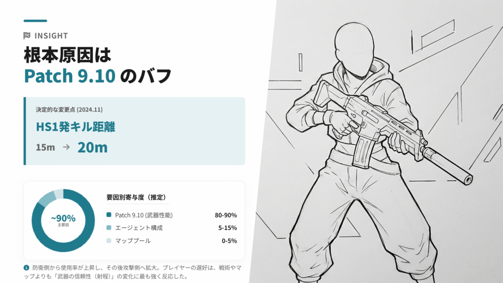 - ファントム使用率上昇の根本原因はPatch 9.10によるHS1発キル距離の15m→20mへの拡大。