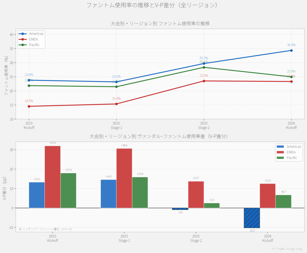 - Americasが最も急激なファントムシフト。 23.79%→34.34%(+10.55pp)で、2025 Stage 2で初めてヴァンダルを逆転。2026 KickoffではV-P = -10.27と完全にファントム優位。
