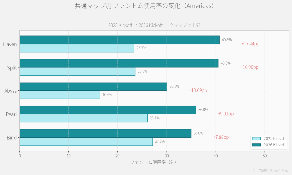 Americas 2025 Kickoffと2026 Kickoffの共通マップ(Haven、Bind、Split、Abyss、Pearl)の5マップについてファントム使用率の変化を見てみます。