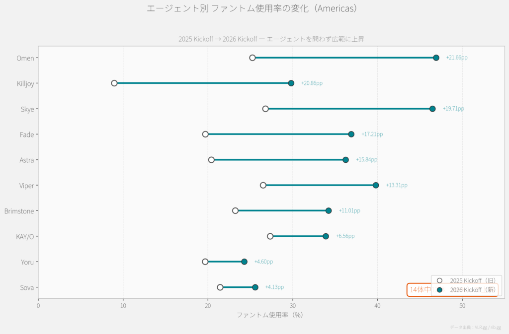 一方で、もっと重要な発見がありました。同一エージェント内でのファントム使用率の変化です。両大会でデータのある主要14エージェントのうち、12体(86%)で同一エージェント内のファントム使用率が上昇していました。