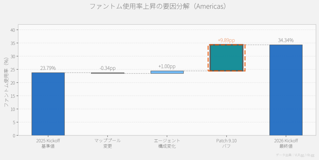 - Patch 9.10のファントムバフ:約80〜90% — 全マップ・全エージェントでの広範な上昇はこれによるもの