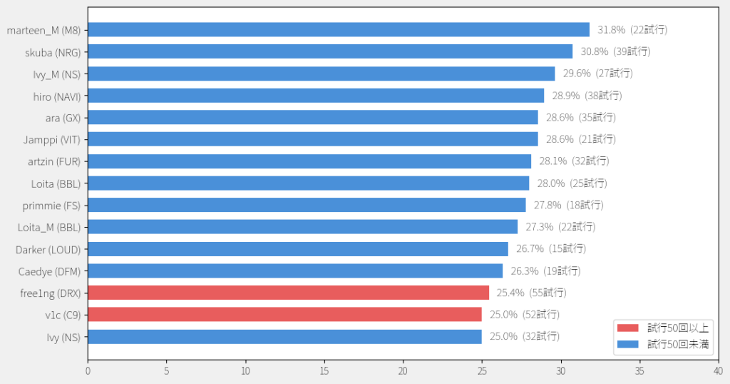 ・試行数が多い選手はコントローラー/センチネル主体であり、これはロールの特性上「最後まで残る」ことが多いため。