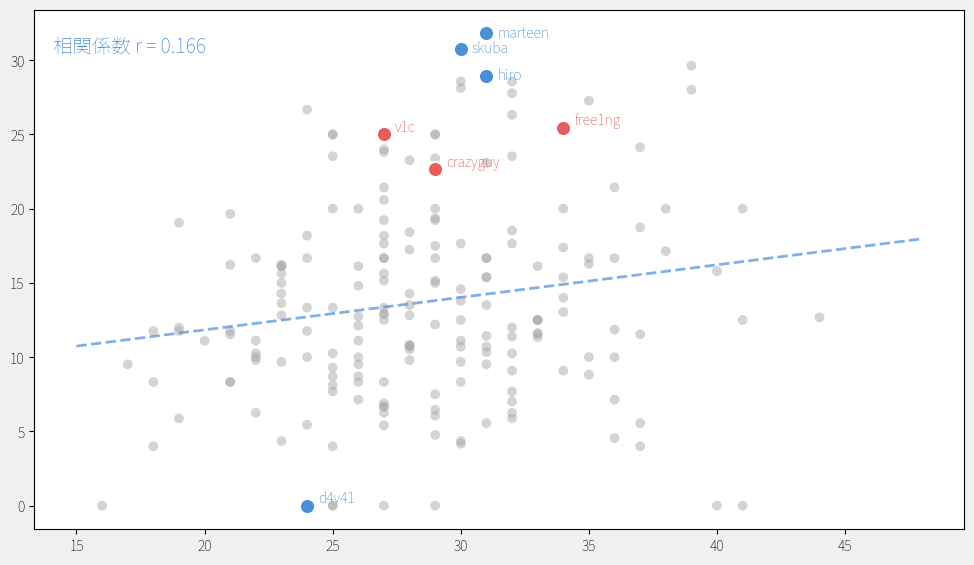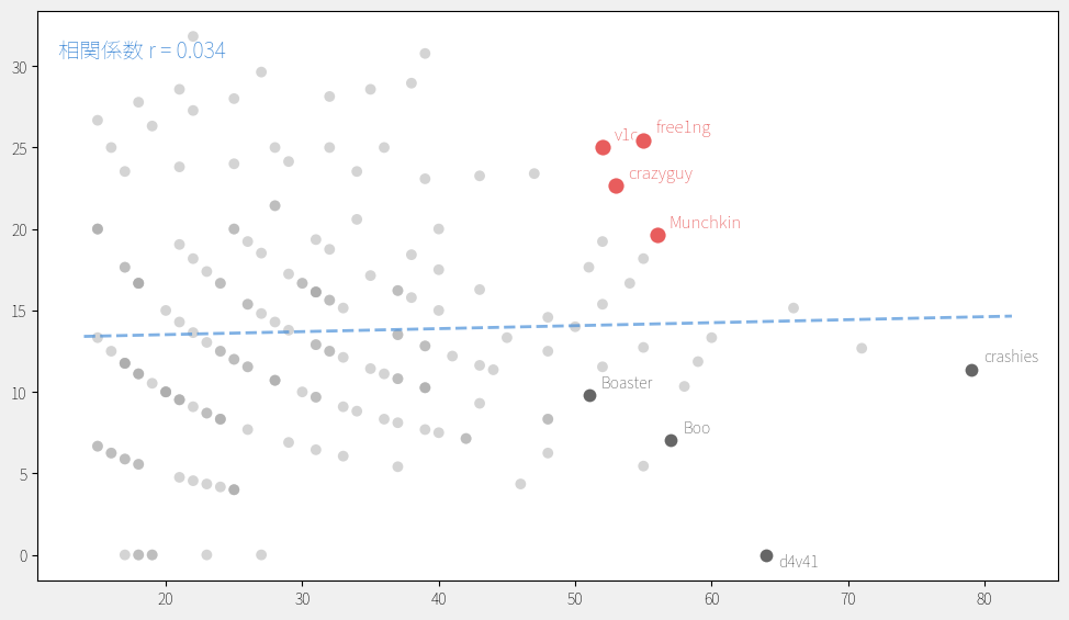 free1ng、v1c、crazyguyの3名は試行数50回以上でありながらCL%が20%を超えるという、データ全体の中で極めて稀な存在です。全データポイントの中でこの条件を満たすのはわずかこの3名のみであり、統計的にも明確な外れ値と言えます。