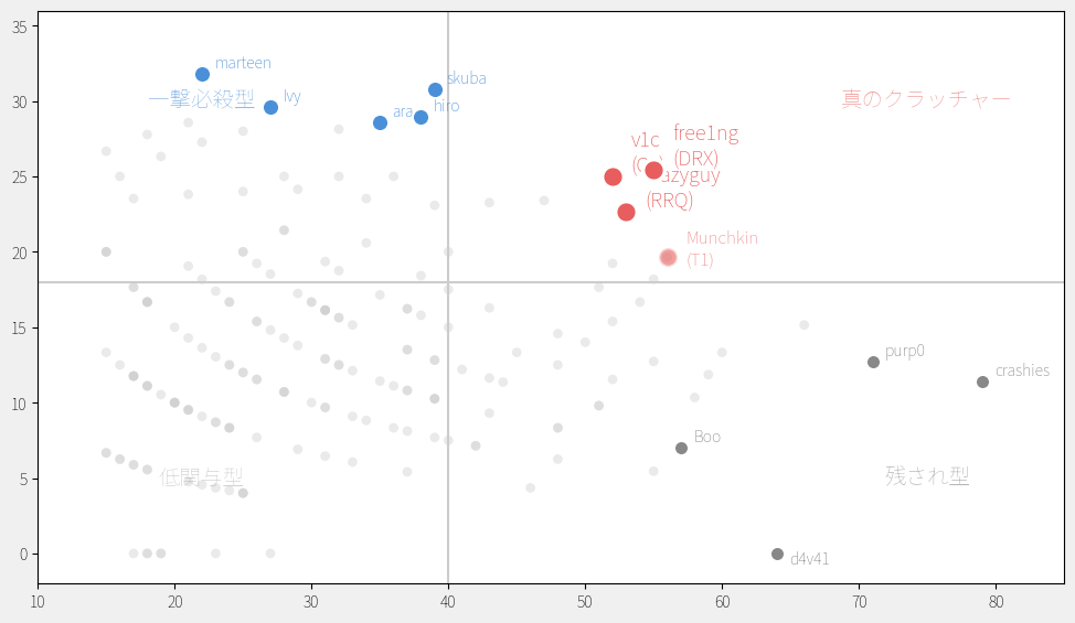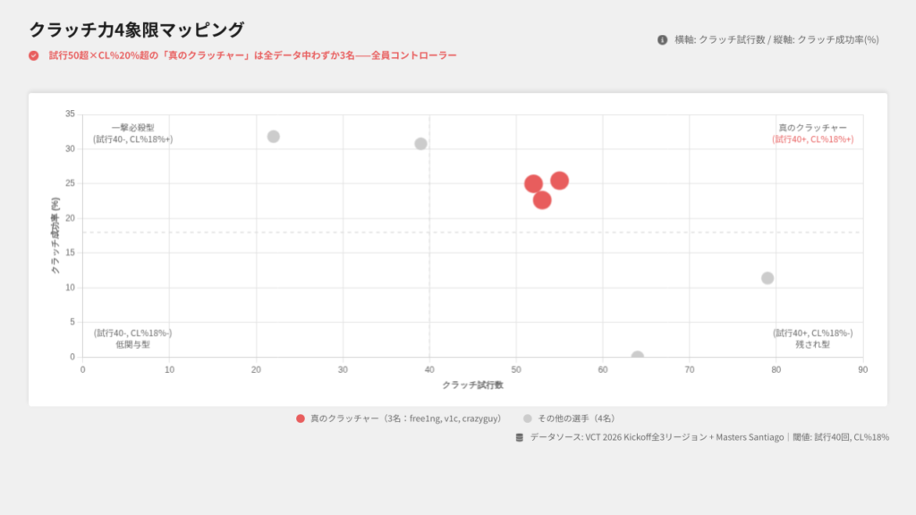 | 右上 | 真のクラッチャー | 試行40+、CL%18%+。量と質を両立する最上位層 | free1ng, v1c, crazyguy, Munchkin |