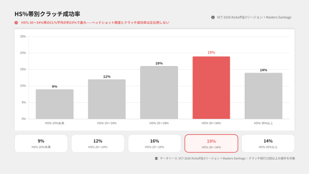 注目すべきは、HS%が30〜34%の帯でCL%平均が約19%と最も高い点です。HS%が上がるほどクラッチも決まるという単純な正比例ではなく、35%を超えるとCL%はやや低下しています。噛み砕いて言うと、HS%が極端に高い選手にはOPer(オペレーター主体の選手)や特殊な立ち回りをする選手が含まれ、クラッチ場面でのライフル戦ではむしろ不利に働くケースがあると考えられます。