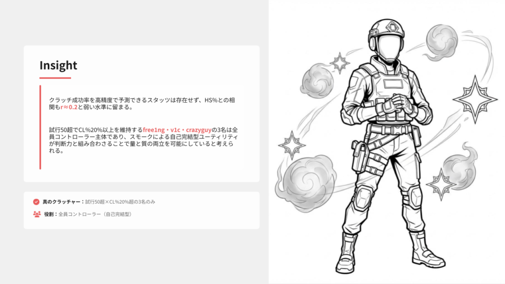 「真のクラッチャー」(右上)は、free1ng(14/55=25.45%)、v1c(13/52=25.00%)、crazyguy(12/53=22.64%)の3名が中核です。Munchkin(11/56=19.64%)はボーダーラインに位置します。3名の共通点は、いずれもコントローラーを主にプレイしていること、HS%が27〜34%と「中の上」であること、そしてチーム内で最後まで残りつつもラウンドをもぎ取る判断力を持っていることです。