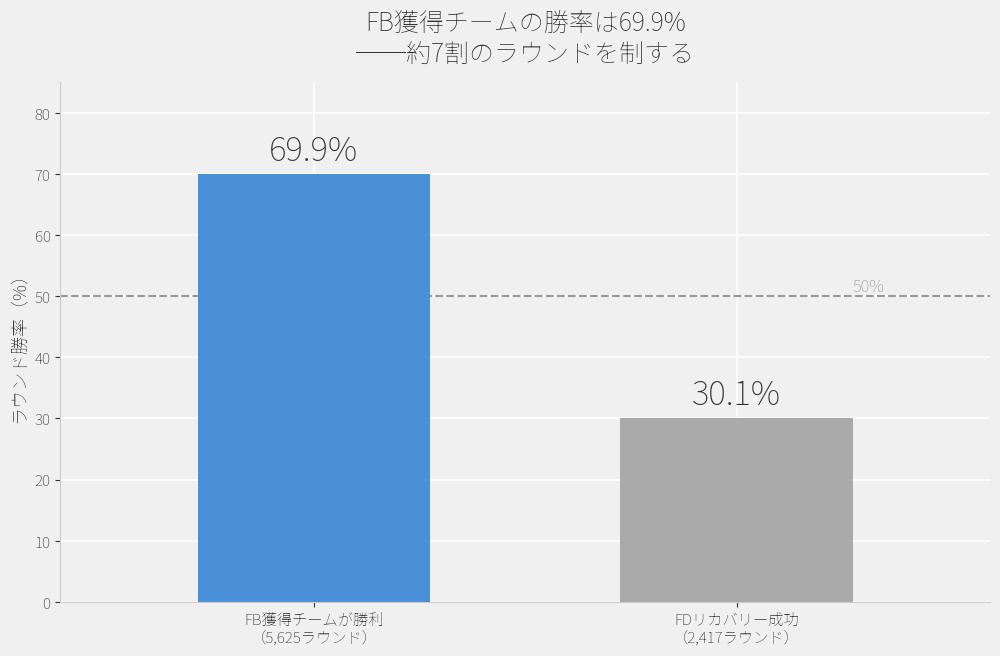 69.94%という数字は、FBの重要性を改めて裏付けるものです。噛み砕いて言うと、FBを取ったチームは約10回中7回そのラウンドを勝利しているということになります。ラウンド序盤の最初の1キルが、そのまま勝敗を大きく左右していると言えます。