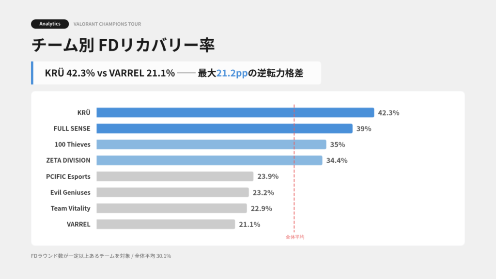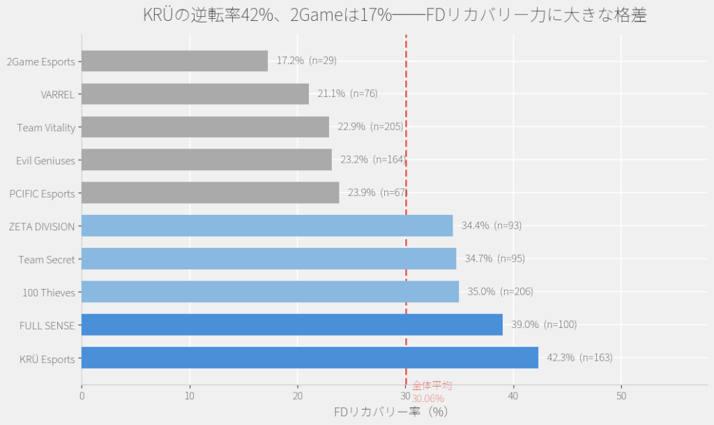 仮説判定:支持。KRÜ Esports(42.33%)をはじめ複数のチームが全体平均(30.06%)を大きく上回るFDリカバリー率を示した。チーム間の差は最大25.09ppに達しており、FDリカバリー力にはチームごとに明確な差がある。