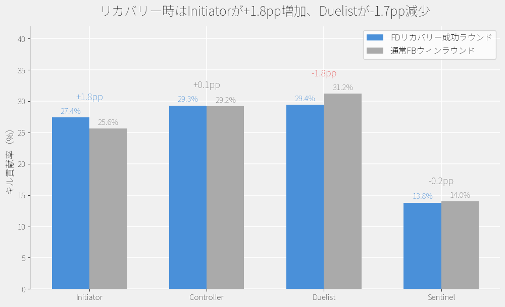 FDリカバリーに成功したラウンドと、通常のFBウィンラウンド(FBを取った側がそのまま勝利)のそれぞれについて、勝利チーム側のロール別キル貢献割合を算出しました。