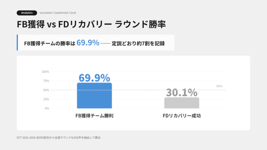 VALORANTにおいてファーストブラッド(FB)を獲得するということは、ラウンド序盤で5v4の人数有利を作ることを意味します。VALORANTコミュニティでは「FBを取ったチームのラウンド勝率は60〜70%程度」という定説が広く知られていますが、実際のVCTプロシーンのデータではどうなっているのか。そして、FBを取られた側──つまりファーストデス(FD)を喫したチームがラウンドを逆転する「FDリカバリー」にはどのような傾向があるのか。今回はこの2つの問いをデータで検証します。