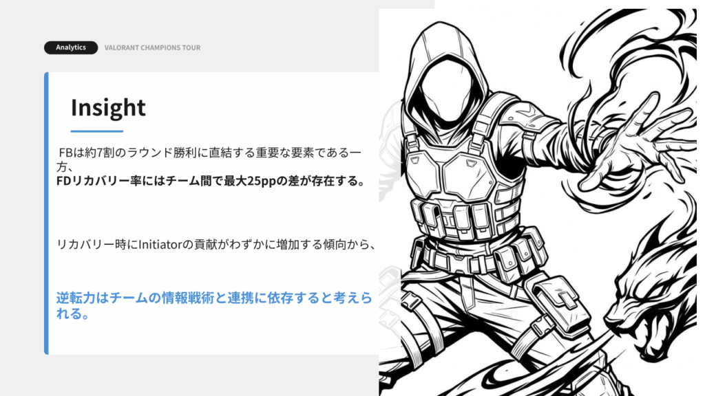 3つの分析を通じて浮かび上がったのは、「FBは依然としてラウンド勝敗に大きく影響するが、FDリカバリー率にはチーム間で明確な差があり、リカバリー時にはイニシエーターの役割がわずかに高まる」という構図です。