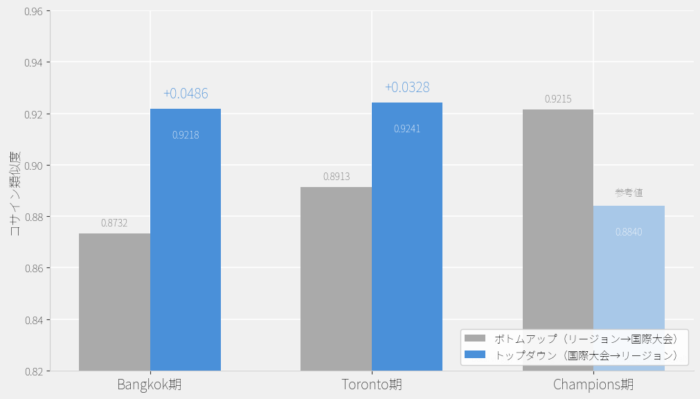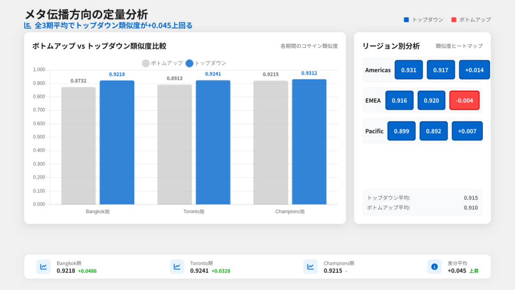 Bangkok期のトップダウン平均(0.9218)はボトムアップ平均(0.8732)を+0.0486上回っています。Toronto期でも同様にトップダウン(0.9241)がボトムアップ(0.8913)を+0.0328上回っています。噛み砕いて言うと、International大会で見られたメタは、その大会に持ち込まれた元のリージョナルメタよりも、大会後のリージョナルメタとの一致度が高いということです。これは「国際大会のメタが各リージョンに波及する」トップダウン型の伝播を定量的に裏付ける結果です。