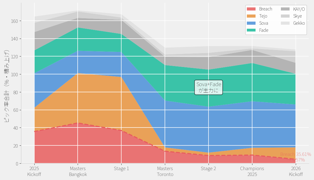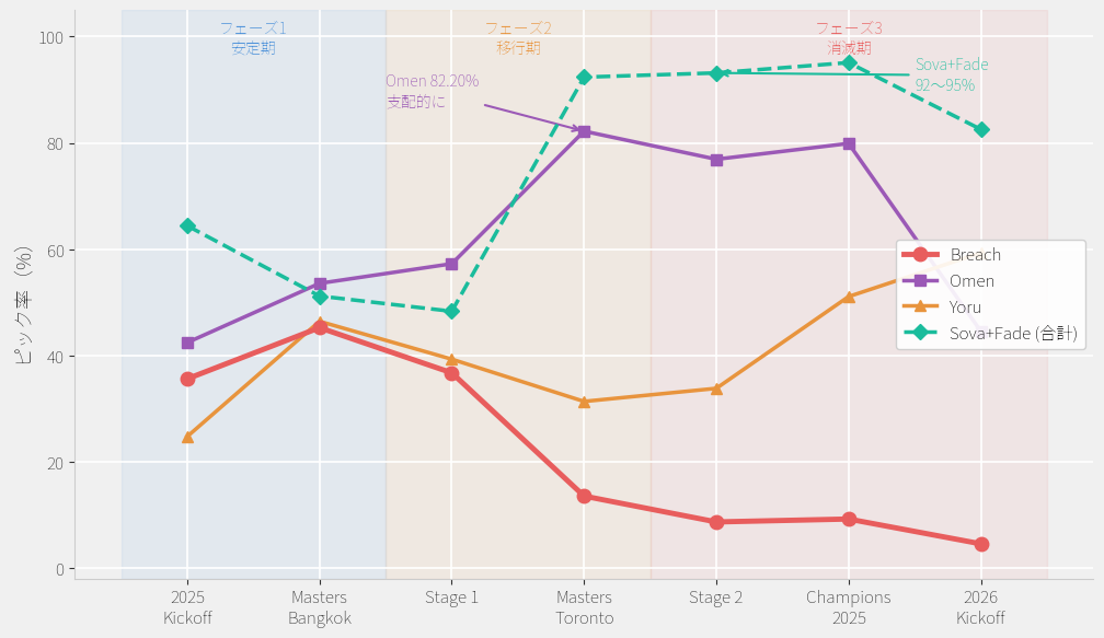 Tejoは散布図の右上に突出して位置し、「Masters Bangkokで+16.52ppの突出 → Stage 1で+29.66ppの増加」という教科書的なトップダウン伝播パターンを描いています。Kickoff時点ではAmericas 32%・EMEA 24%・Pacific 30%と地域差がありましたが、Masters Bangkok後のStage 1ではAmericas 68%・EMEA 52%・Pacific 55%と全リージョンで50%を超え、メタの中心エージェントとなりました。