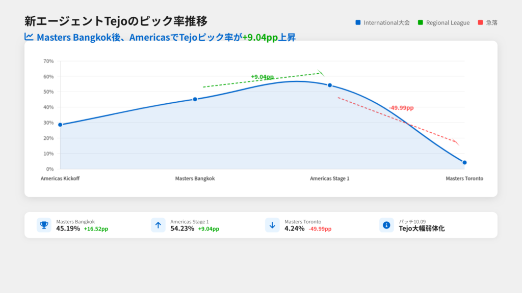 ここまでで全体像を把握しました。次に検証するのは、「具体的にどのエージェントがInternational大会を起点としたメタ変動を引き起こしたか」です。仮説として「Masters BangkokでのTejoの高ピック率(45.19%)がStage 1全リージョンに波及し、典型的なトップダウン伝播の事例となっている」と設定します。