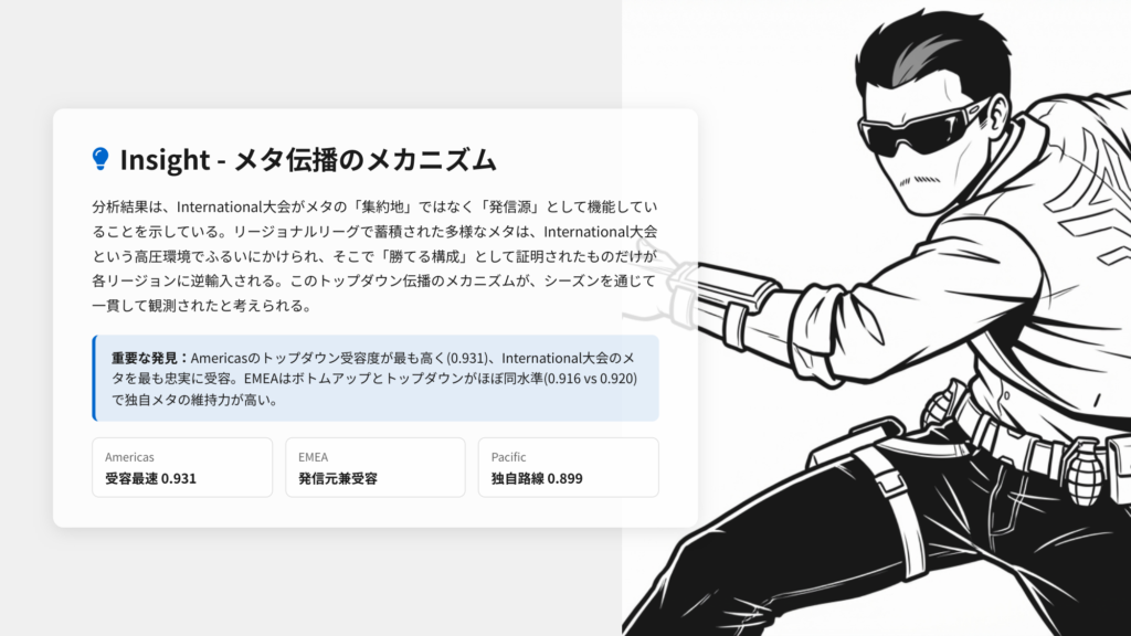 仮説判定:「Pacificは独自路線を維持する」は支持。Americasが最もトップダウン受容度が高い点は仮説通りですが、EMEAは予想に反してAmericasに近い受容度を示しました。これはTeam LiquidやFNATICなどEMEAの国際大会常連チームの影響と考えられます。