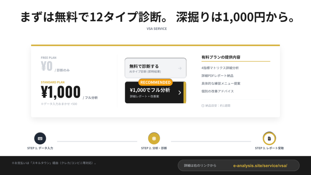 そこで今回は、「客観的なデータを用いて、自分の強みと弱みを丸裸にする」ためのサービスを開発しました。これまでのブログ運営で培ったデータ分析のノウハウを、個人のプレイヤーに応用したのがこの「VSA」です。