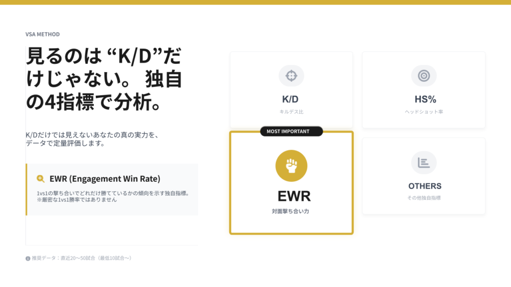 - 独自のEWR指標:K/Dだけでは見えない「対面力」を可視化する。