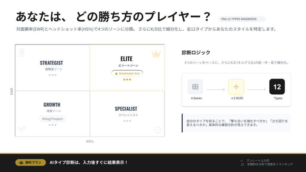 例えば、全指標が高い「Dominator Ace(ドミネーター・エース)」タイプなのか、あるいは撃ち合いは弱いが立ち回りで貢献するタイプなのか、自分の現在地を明確な「型」として可視化します。
