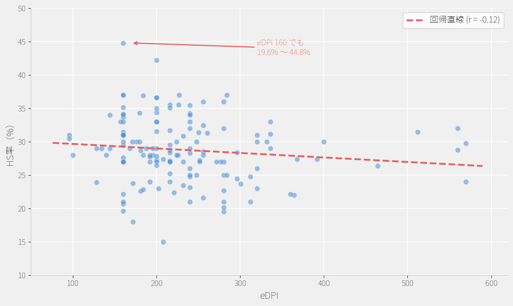 散布図を見ると、データポイントは全体的に横方向へ広く分散しており、右下がりの明確な傾向は視認できません。回帰直線はほぼ水平に近く、eDPIが変化してもHS率はほとんど動かないことが一目でわかります。