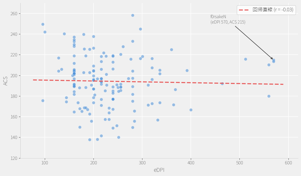 r = −0.03はほぼゼロであり、eDPIとACSの間には相関が存在しないと断言できる水準です。決定係数R²はわずか0.1%で、eDPIがACSに与える影響は統計的にまったく検出できません。