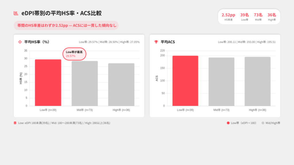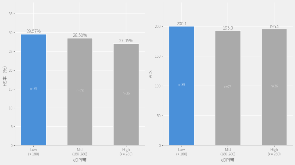 ACSに関してはさらに興味深い結果です。Low帯が200.11、Mid帯が193.00、High帯が195.51と、一貫した右下がりのトレンドが存在しません。Mid帯がもっとも低く、High帯がMid帯を上回るという「逆転現象」が起きており、eDPIが低いほどACSが高いという仮説を直感的にも否定する結果になっています。