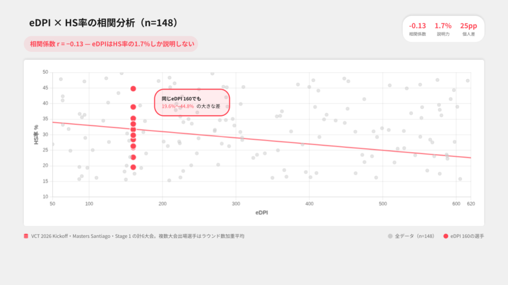 そこで今回は、VCT 2026の主要6大会に出場した148名のプロプレイヤーのeDPIとトーナメント成績を突き合わせ、ピアソンの積率相関係数を用いた定量分析を実施します。具体的には「eDPIとHS率の相関」「eDPIとACSの相関」「eDPI帯別の平均値比較」の3ステップで検証を進めます。結論を先取りすると、eDPIとHS率の相関係数はわずかr = −0.13にとどまり、統計的に有意とは言えない水準でした。「ローセンシだからHS率が高い」とは言えない――それがデータの答えです。