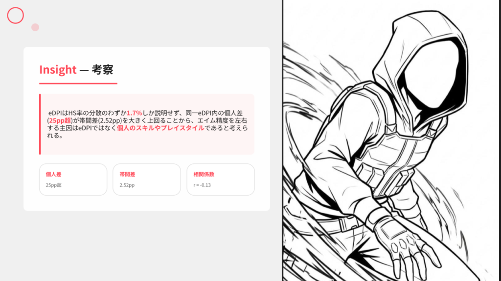 • eDPI帯別の平均HS率差はわずか2.52ppにとどまり、帯内の個人差(約27pp)に比べて極めて小さい