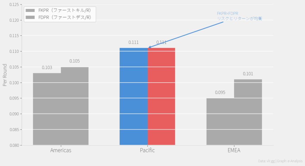 • FK-FD差分(ファーストキルとファーストデスの差)で見ると、Pacificが±0でトントン、Americas・EMEAはマイナスとなっています。Pacificはリスクを取る分だけ見返りも得ていると解釈できます。