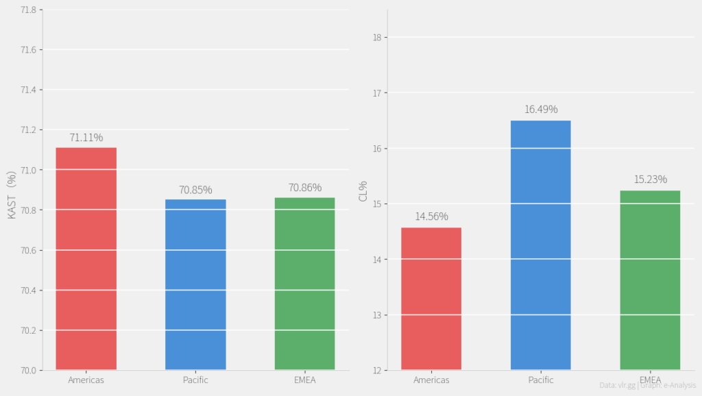 • EMEAはFKPR・FDPRともに最低値であり、序盤のデュエルを避ける傾向が顕著です。これは後述するKAST(安定性)の高さと整合します。