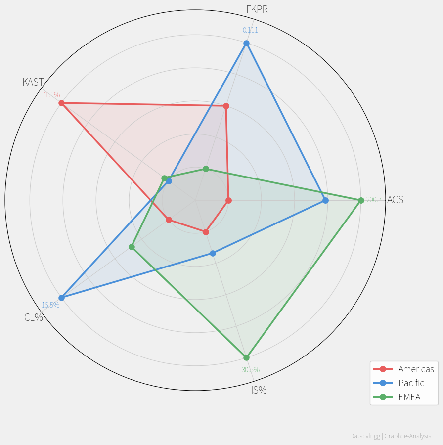 • AmericasはKAST(71.11%)とAPR(0.260)がトップの「チーム連携型」リージョン。個の突出よりシステムの厚みで勝つスタイル。