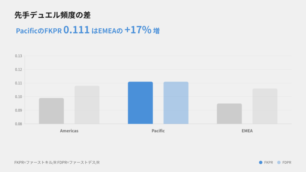 • PacificのFKPRは0.111で3リージョン中最高。EMEAの0.095と比較すると+0.016の差があり、先手を取りにいく頻度が明確に高いと言えます。