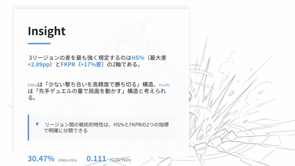 • 噛み砕いて言うと、EMEAは「デュエルの回数は少ないが、撃ち合いの質(精度)が高い」というプロファイルが浮かび上がります。